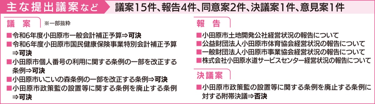小田原市議会6月定例会が6月10日から27日まで開かれた。市は一般会計補正予算や条例の一部改正など15件の議案を提出した。今回は小田原市政策監の設置等に関する条例について廃止する案が提出され、「可決」となった。また同議案については、附帯決議案が議員3氏から提出されたが、「否決」された。ほか、報告4件、同意案2件、意見案1件も提出され審議、議決された。