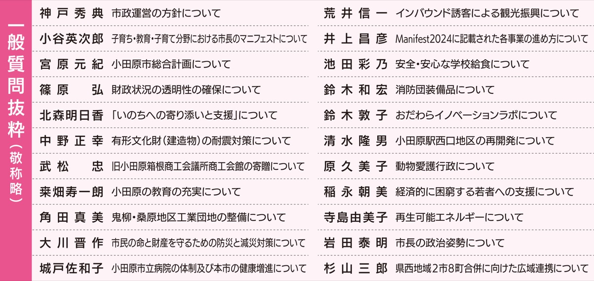 一般質問は市議26人(議長等含む)中22人の議員が登壇。加藤憲一市長ら執行部に対し、小田原駅西口地区の再開発や市立病院、鬼柳・桑原地区工業団地の整備、学校給食費の無償化などについて内容を市側に質した。