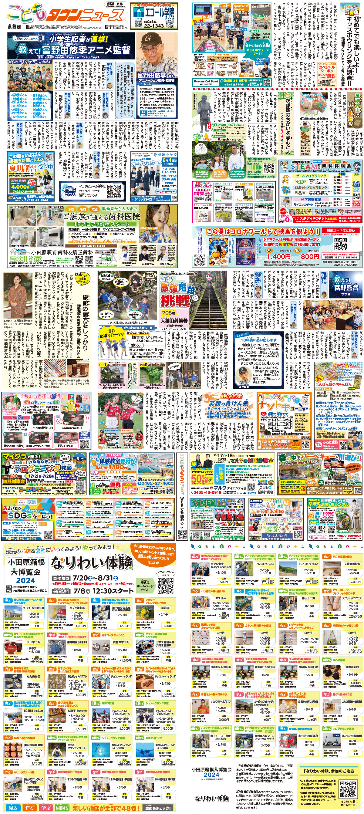 みんなが住む県西2市8町のまちのことをたくさん集めた「こども新聞」。今回は、小学生記者による小田原出身のアニメ監督・原作者の富野由悠季監督のインタビューや、県西の「最強階段」、金次郎像のとくちょうなどについててを全力取材。夏休みの思い出づくりにもぴったりな「なりわい体験」も大特集。素敵な読者プレゼントも用意しているので読んでみてね