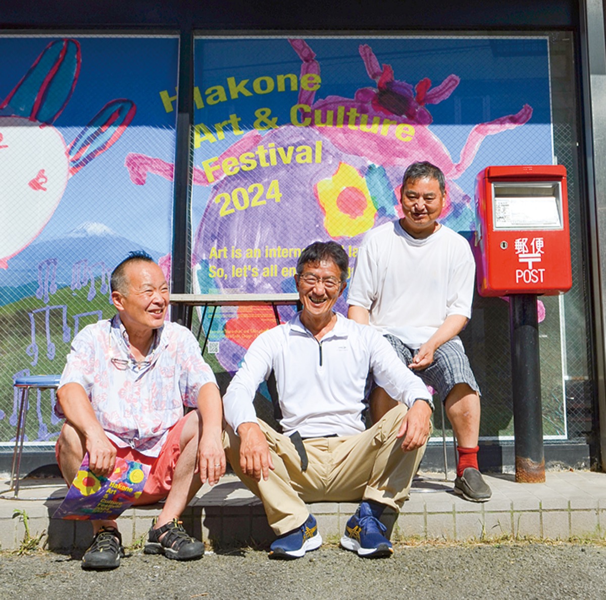 同芸術祭の発起人でもある写真家の遠藤桂さん(強羅在住)の写真に、町内の5歳児が描いたテントウムシと巫女の絵を合わせたコラージュ作品の前で、期間中は同商店で購入した酒を飲む「角打ち」ができる。遠藤桂さんは「アートは湧き出るものが原点。感情のままに表現する子どもを見習いながら、みんなでアートを楽しみましょう」と呼び掛ける。