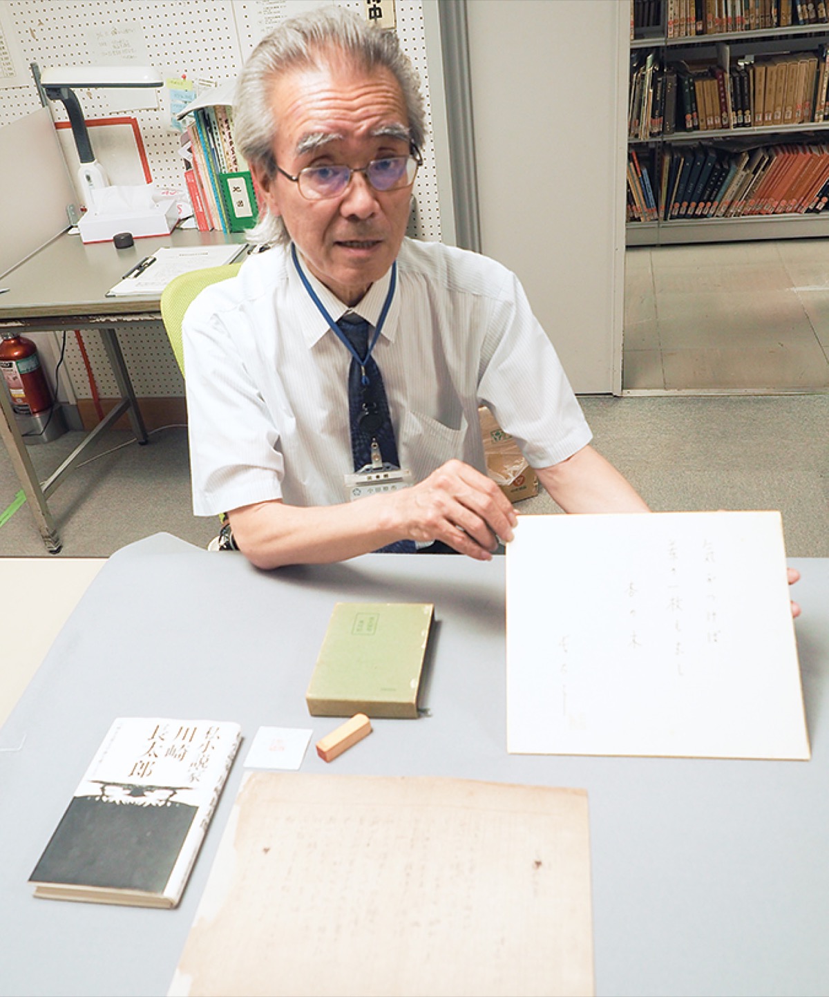 小田原市の図書館と交流が深く、川崎の死後、市が多くの資料を保管。今回の展示では、俳句をテーマに立秋やその後の情景を詠んだとみられる15句の俳句連作「しほざゐ集」の自筆原稿を市として約20年ぶりに公開する。同集は当時、小田原の文化雑誌で掲載を予定していたが発行されず、死後に別の雑誌で発表された逸話もある原稿。また、資料を整理する中で、数年前に自作の俳句色紙への押印が確認された落款印(印文「長太郎」)も展示する。