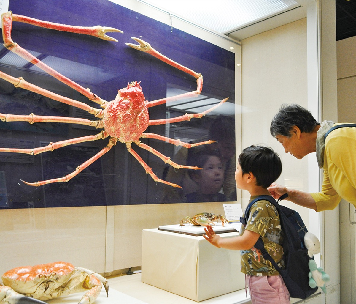 夏休みの期間を迎え、館内は多くの家族連れでにぎわいを見せている。埼玉県から来た川本晃弘くん(3)は世界最大のタカアシガニの標本にくぎ付け。「おおきい」と驚きながら、長い脚を熱心に観察していた。