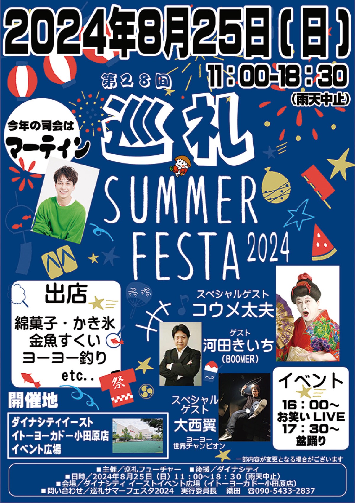 主催は小田原市川東地区のまちづくり団体「巡礼フューチャー」。当日は綿菓子やかき氷、ヨーヨー釣り、金魚すくいなどお祭りならではの模擬店や、キッチンカーが出店する。タレントのマーティンさんが司会を務めるほか、ヨーヨー世界チャンピオンの大西翼さんが来場。またよさこいやフラダンスチームなどが会場を盛り上げる。