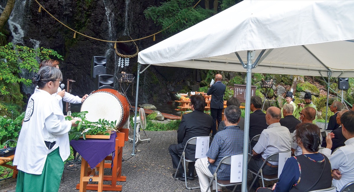 神様の御加護や水の恵みに感謝する、150年以上前から続く神事。箱根神社の宮司が執り行い、奉賛会関係者や地元の観光協会、自治会関係者らが玉串を捧げた。その後、参拝者は「玉簾の瀧」から汲んだ「延命水」と呼ばれる水を飲み、健康長寿や開運、商売繁盛を祈願した。天成園取締役総支配人の杉崎芽富さんは「一人でも多くの方に玉簾神社に参拝いただくよう精進していきたい」と話した。