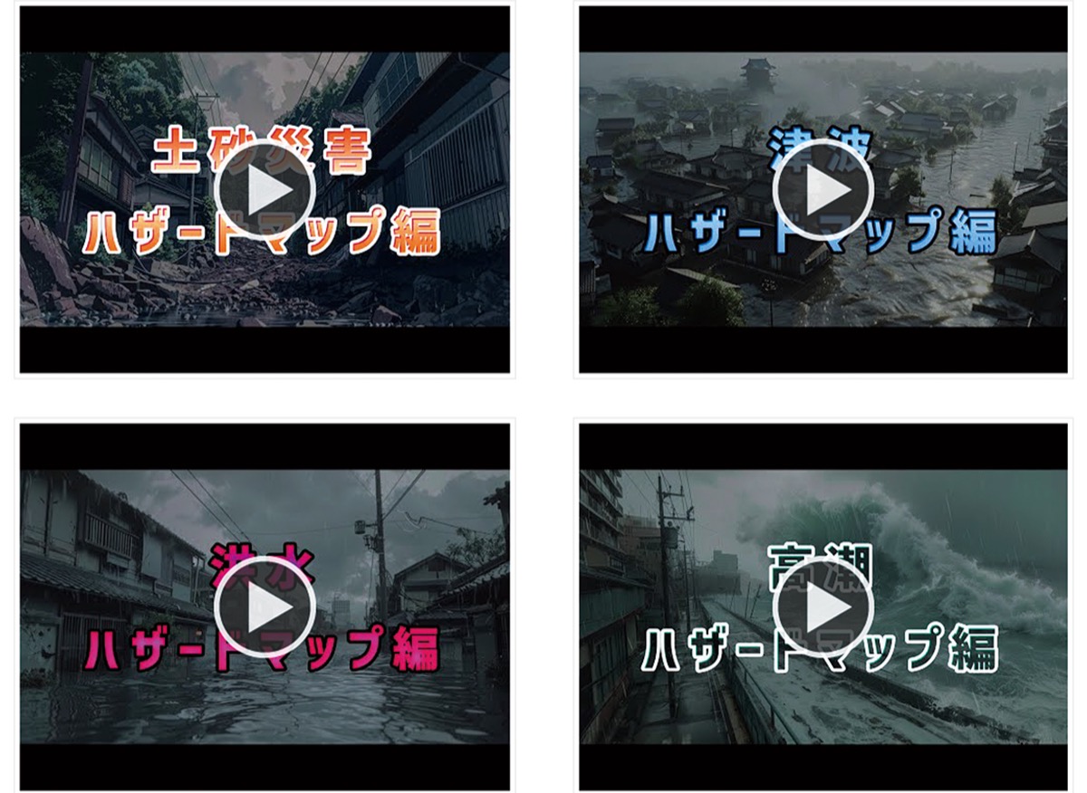 ハザードマップは、自然災害の被害軽減や防災対策に使用する目的で、被災想定区域や避難場所などを表示した地図。市が制作したハザードマップ編の動画は「土砂災害」「津波」「洪水」「高潮」の4種類。ハザードマップの見方のほか、読み解いた情報から分かる避難行動などについて、各項目ごとに図や表を使って分かりやすく解説している。また、広域避難所に設置している炊き出し器といった資機材の取り扱いに関する動画も、合わせて公開中。