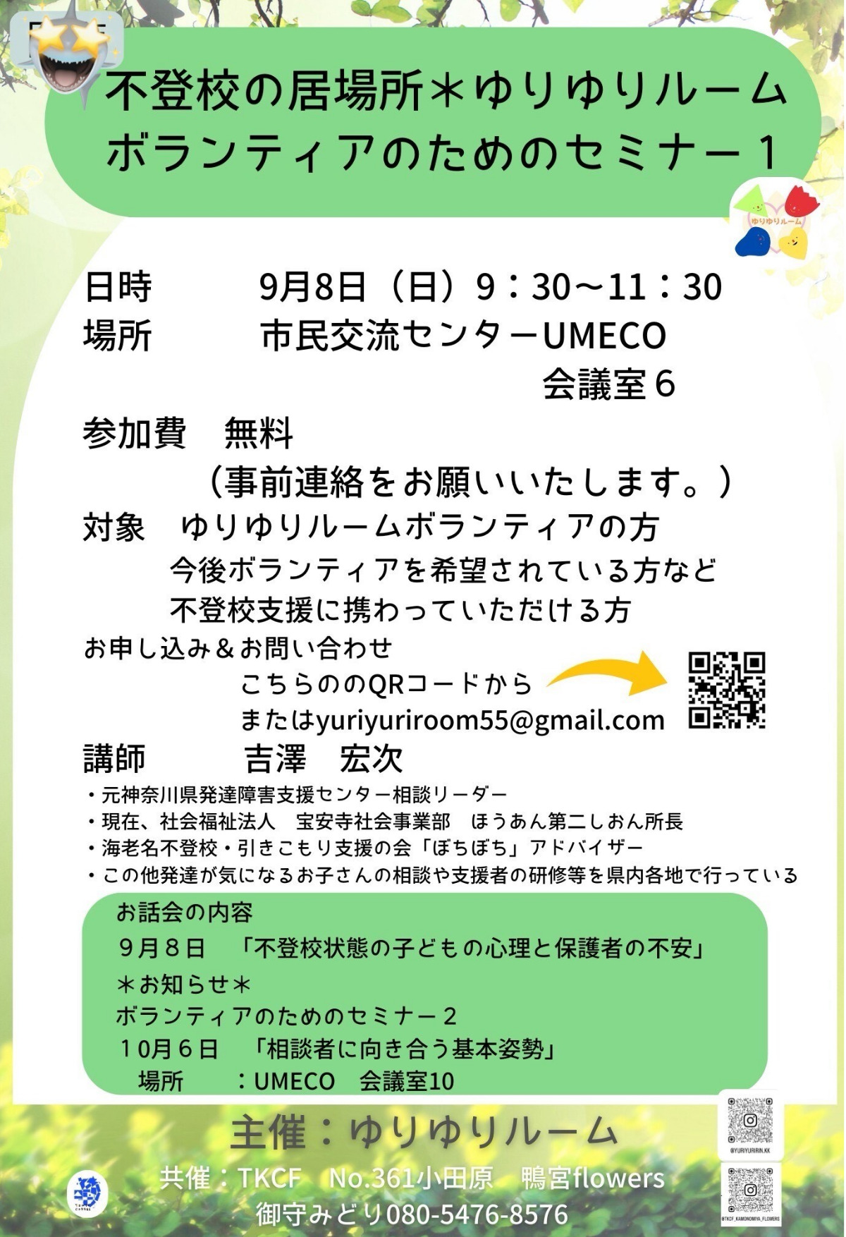 小田原市栄町に9月4日(水)開所予定の「不登校の子の居場所ゆりゆりルーム」(香川千代美主宰)が8日(日)、不登校支援やボランティアに携わることのできる人を対象におだわら市民交流センターUMECOでセミナーを開催する。元神奈川県発達障害支援センターケースワーカーの吉澤宏次さんが「不登校状態の子どもの心理と保護者の不安」について話す。午前9時30分〜11時30分。参加無料。要事前申込み。申込み、問い合わせは同所✉yuriyuriroom55@gmail.com。