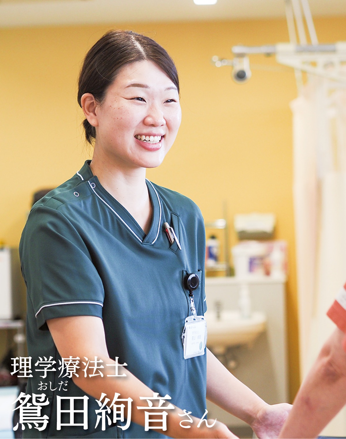 リハビリテーション科で理学療法士として勤務する鴛田(おしだ)絢音さんは、3歳児を育てるママセラピスト。出産を経て「子育てとの両立、資格取得などの勉強もしたい」と週4回のパート勤務を選択。指導体制も整っており、スムーズに復職できたという。「患者さんが元気になり、喜んで頂けるのがうれしくて」と笑顔。また、「職域を超えて相談しやすい雰囲気も魅力。患者さんや地域に向けて、できることに取り組めるのも間中ならでは」と目を輝かせた。