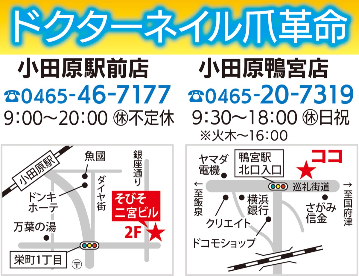 鴨宮店…鴨宮349 石黒ビル1階D 小田原駅前店…栄町2-13-1そびそ二宮2A