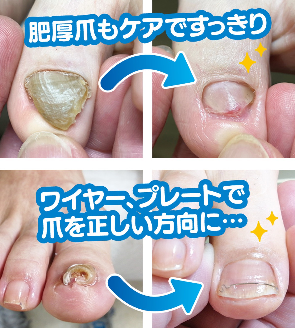 専門の知識と技術で全国に展開する150店舗が年間23万件の相談に向き合うフットケアの専門店。シックネイルケアセラピストが独自ワイヤーでの巻き爪矯正や肥厚爪ケア、タコや魚の目除去、角質ケアのほか、爪切りにフットリフレまで対応してくれる。