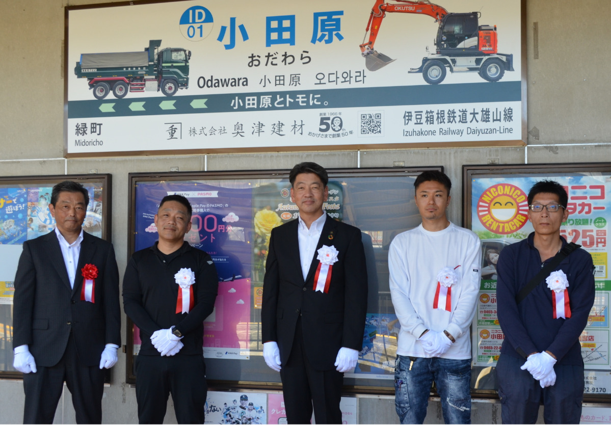 奥津建材は1955年設立の総合建設会社。旧小田原市民会館の解体撤去工事を請け負うなど公共事業に携わることから、「地元に貢献したい」と、同駅のスポンサーに名乗り出た。この締結により2年間、小田原駅の副駅名は「小田原とトモに。」となる。