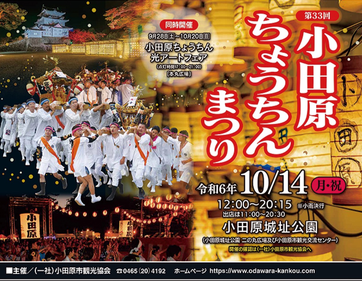 二の丸広場にはキッチンカーなど物販ブース約30店舗が集結し、ステージでは市内中学・高校による吹奏楽部の演奏で開幕(正午〜)。風魔忍者ショーや小田原囃子の演奏、小田原ちょうちん踊り、和太鼓演奏などが披露される。また、小田原市出身の門松みゆきさん、箱根芸者の夢路さんによる歌謡ショー(午後2時40分〜)のほか、大ちょうちん点灯式(5時〜)、市内自治会のみこしパレード帰着式など、多様な演目がまつりを彩る。