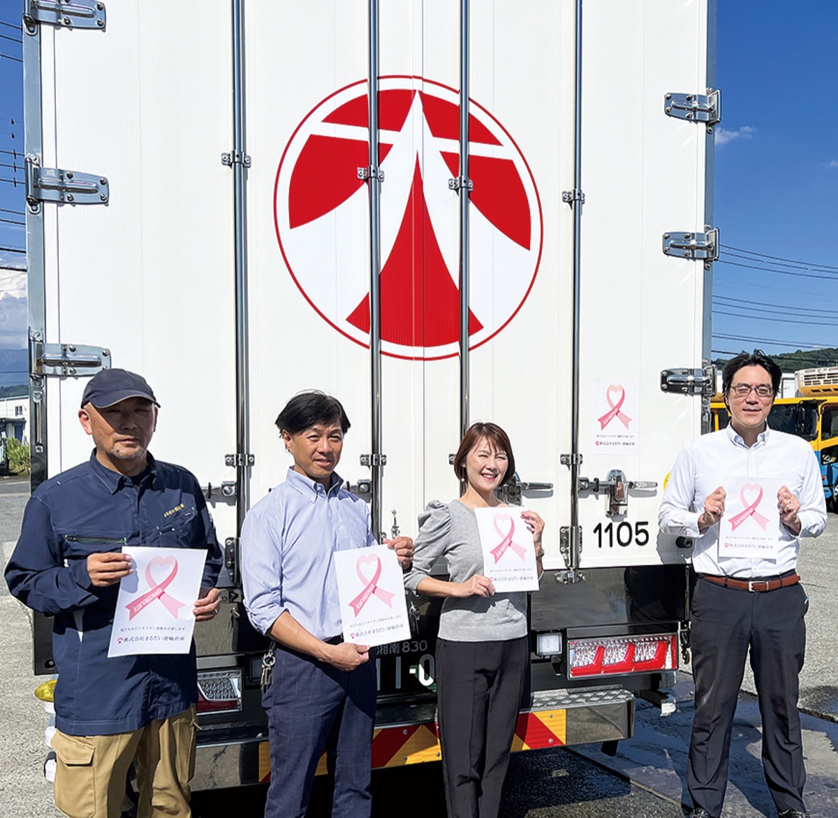 運送、倉庫業を営む株式会社まるだい運輸倉庫(小田原市/秋元美里代表取締役社長)が、10月7日から順次、自社で保有する輸送トラック約100台にピンクリボンのステッカーを貼り、街中を走行している。県内各地をライトアップする「ピンクリボンライトアップ2024inかながわ」の関連事業として実施した。