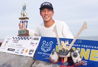 小田原市出身のプロサーファー、鈴木仁選手(23)が9月に宮崎県で行われたワールドサーフリーグ(WSL)公認の地区大会(QS3000男子)で優勝を果たした。鈴木選手のQS大会優勝は5年ぶりとなる。