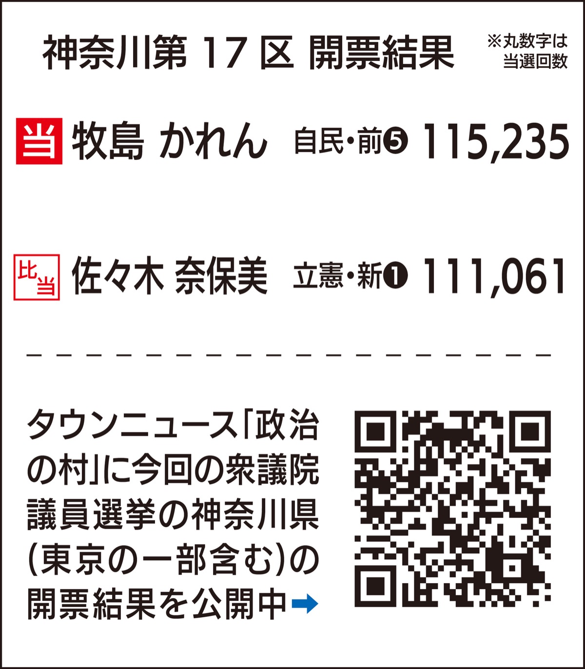 第50回衆議院議員総選挙が10月27日に投開票され、神奈川17区(小田原市、秦野市、南足柄市、二宮町、足柄上・下郡)では、自民党の前職、牧島かれん氏(48)が約11万5千票を獲得し、5回目の当選を果たした。