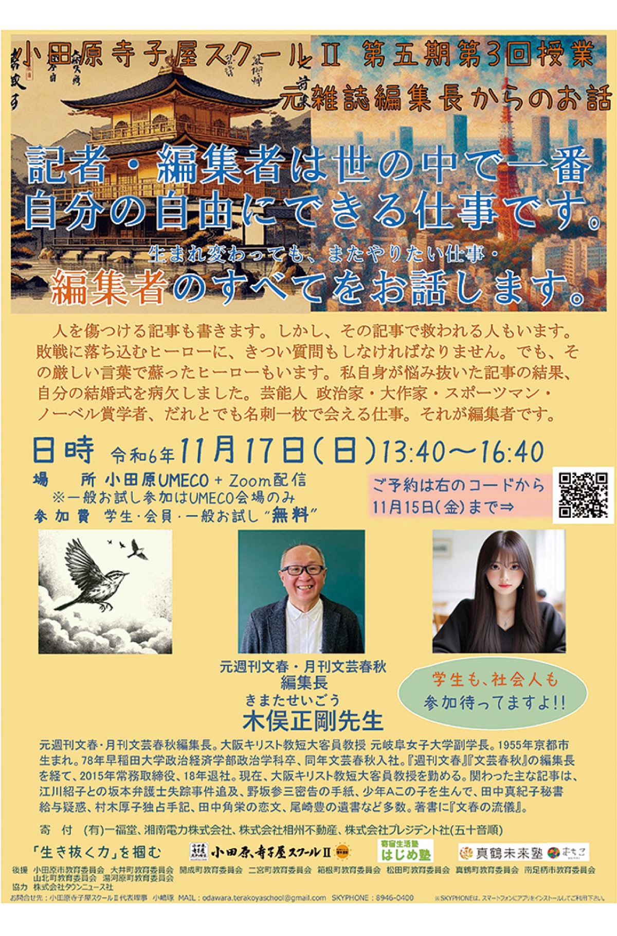 小田原寺子屋スクールII(小嶋琢代表理事)が、11月17日(日)におだわら市民交流センターUMECOで行う授業「生まれ変わっても、またやりたい仕事・編集者のすべてをお話します。」の参加者を募集している=写真。