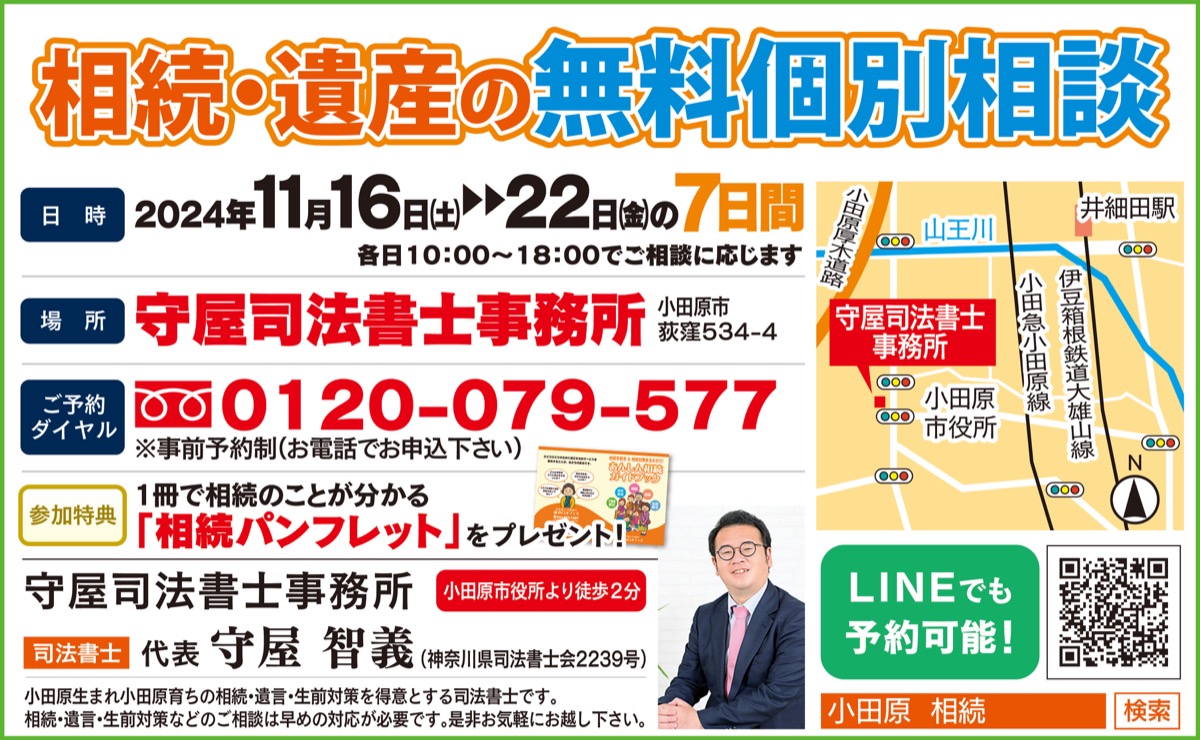 相続や遺産の相談をこれまで2080件超受けてきた守屋司法書士事務所(小田原市役所すぐ)が11月16日(土)から22日(金)、毎回好評の無料相談会を実施する。
