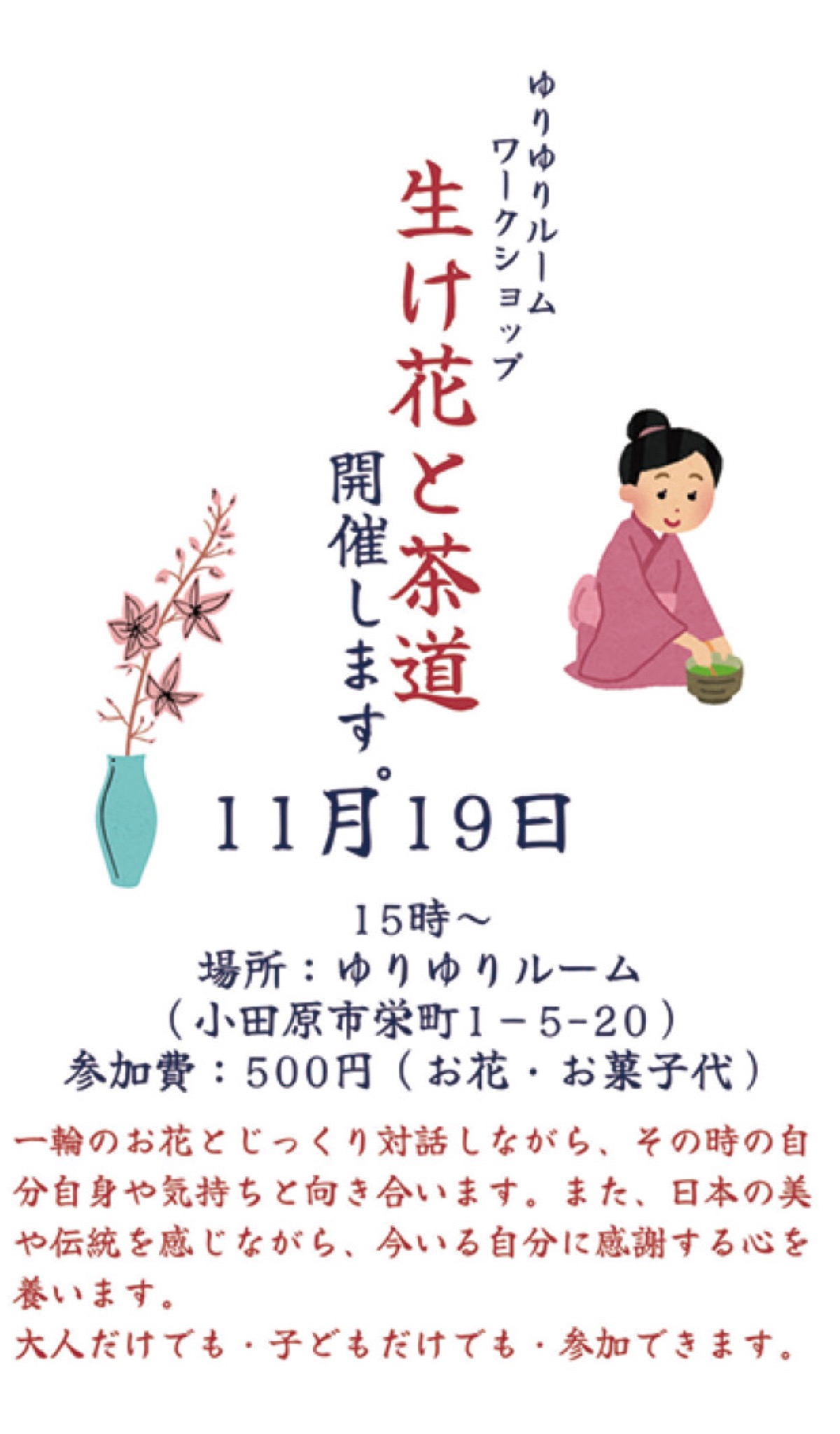今年9月に開所した「不登校の子の居場所ゆりゆりルーム」(香川千代美主宰)が、同所利用のきっかけになればとワークショップを開催している。11月は19日(火)に「生け花と茶道」を、27日(水)に「火山実験」を行う。共に午後3時から、会場は「ゆりゆりルーム」(小田原市栄町1の5の20)、参加費500円。大人だけ、子どもだけの参加も可能。申し込みは同所【メール】yuriyuriroom55@gmail.com。