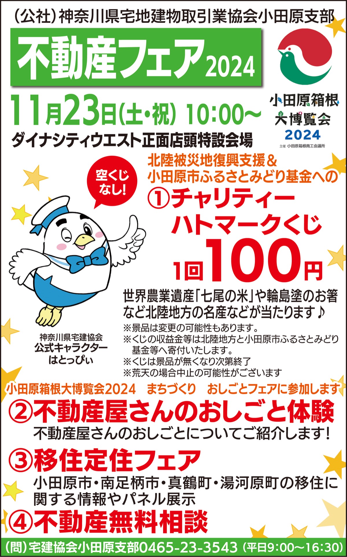 北陸被災地支援&小田原市ふるさとみどり基金への「チャリティーハトマークくじ」や不動産屋さんのおしごと体験のほか、移住定住フェア、不動産無料相談などイベントもりだくさん。遊びに行こう!