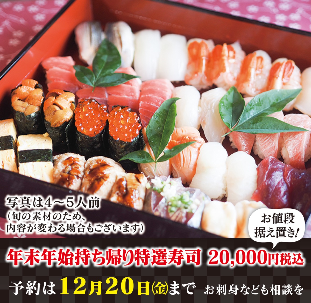 旬のネタを惜しげもなく握った寿司は、年末年始の家族の団らんにぴったりのご馳走だ。しかも、お値段据え置きとあってお財布にも優しい。寿司のほか、刺身なども人数に合わせた注文も可能。受け渡しは12月31日、1月1日は正午〜午後5時、2日は正午〜午後4時。12月20日(金)までに予約を。通常営業は年末は12月30日(月)まで。