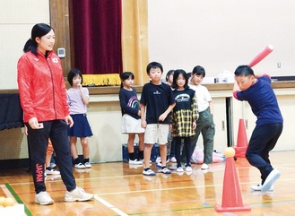 ソフトボール元日本代表の峰幸代さんによるスポーツイベントが11月11日、小田原市立国府津小学校の体育館で開催され、同小放課後児童クラブを利用する2〜5年生約30人が参加した。