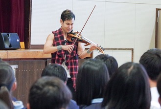 生まれつき障害があり、学生時代にいじめを受けたという式町さん。ハンディを乗り越え、バイオリニストとして活躍するまでの経験を語った。壁を乗り越えることについて、「弦は張り替えれば直るが人はそうはいかない。自分自身を大切にして夢を叶えてほしい」とエールを送り、生徒らは熱心に耳を傾けた。
