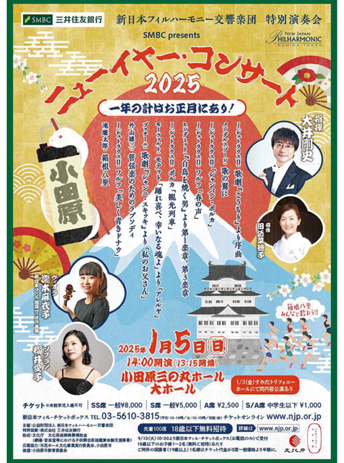 故・小澤征爾氏や山本直純氏の声掛けで創立され、50年以上国内外で多彩な演奏活動を続けている同楽団。当日は指揮者に大井剛史氏を迎え、ビオラ奏者の瀧本麻衣子氏、ソプラノ歌手の櫻井愛子氏らが登場。鮮やかな音色で新春を彩る。