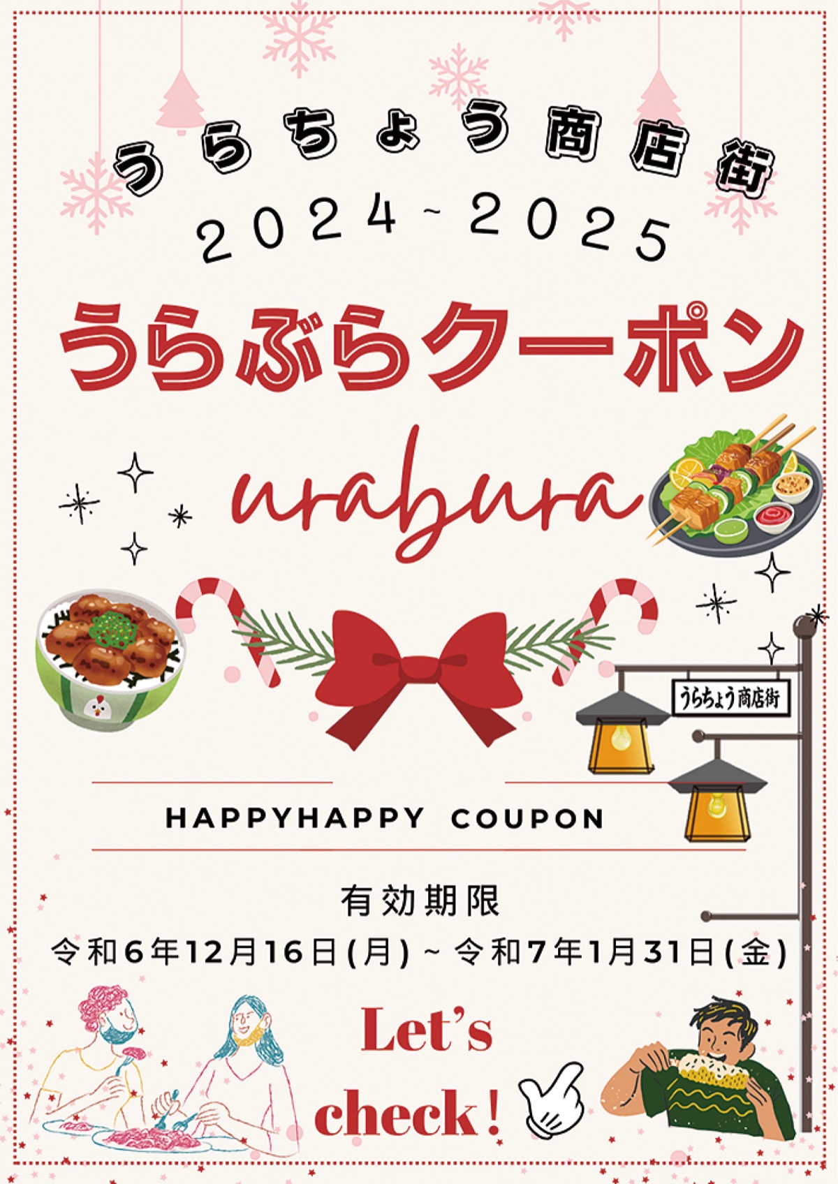 個性豊かなお店が並ぶ「うらちょう商店街」では、現在『うらぶらクーポン』を販売中。1冊5千円で購入し加盟店で6500円分(500円券13枚)として使えるお得企画。