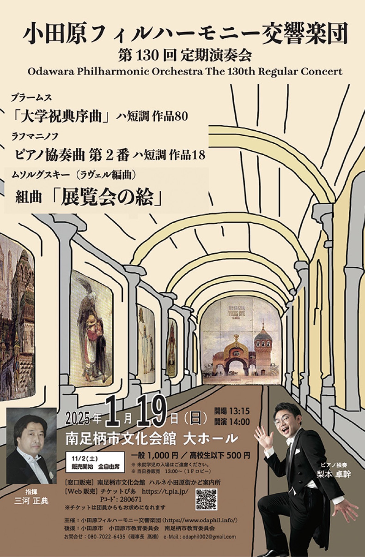 ブラームスの「大学祝典序曲」、ラフマニノフの「ピアノ協奏曲第2番」などを演奏。チケットは一般席1千円、高校生以下500円。※未就学児入場不可。南足柄市文化会館窓口やハルネ小田原街かど案内所などで販売(当日券あり)。(問)高橋さん【電話】080・7022・6435