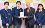 生徒会長の大庭壮真さん(2年)と副会長の酒井太登(だいと)さん(同)、鈴木悠天(ちから)さん(同)が昨年12月に小田原市社会福祉協議会を訪れ、共同募金(年末たすけあい募金)に35万219円を寄付。