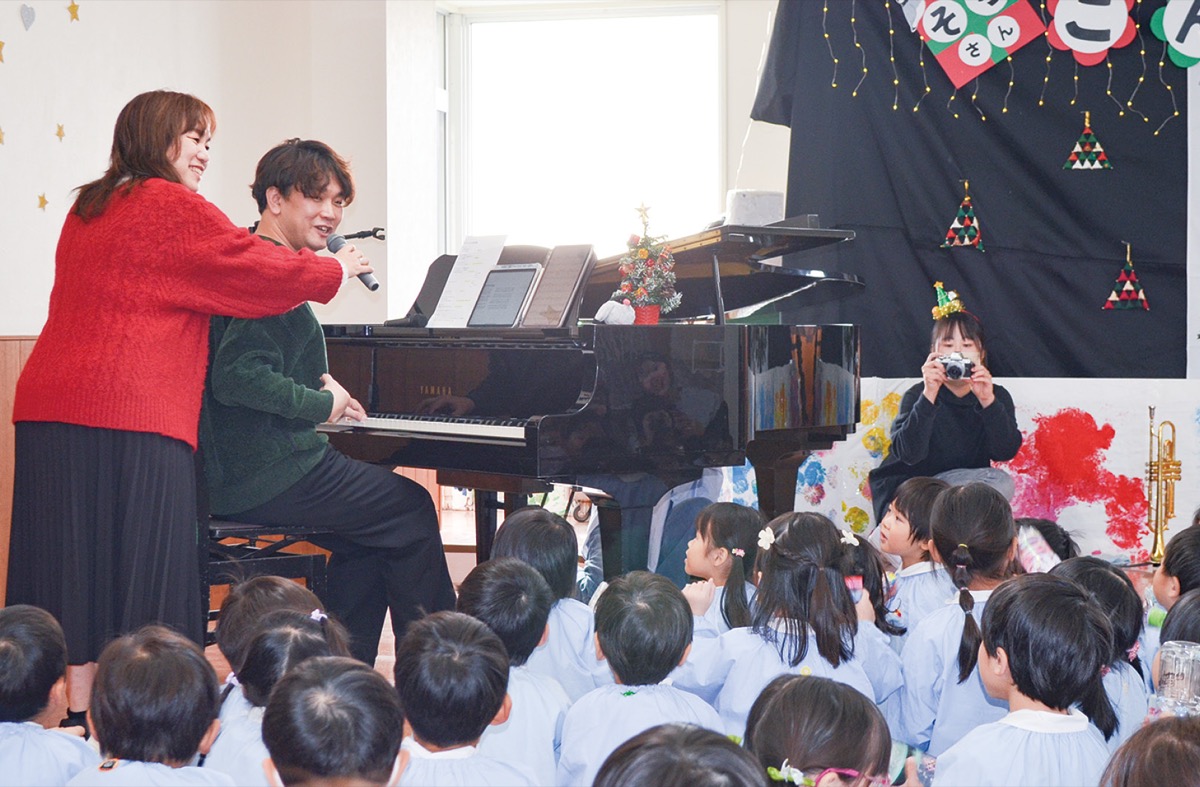 道徳学園こゆるぎ幼稚園(小田原市永塚)で昨年12月、コンサートが行われ、ミュージシャンの藤井空さん、林奈穂さんが園児に演奏を披露した。