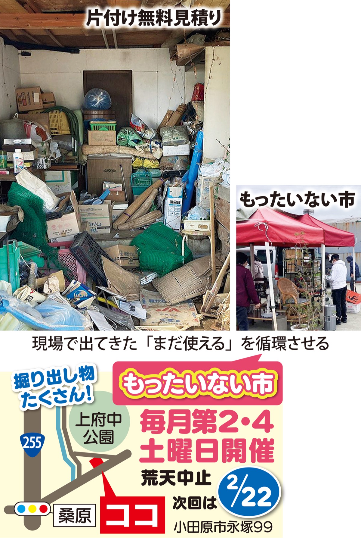 片付けや解体のプロフェッショナル(株)ベインズ(小田原市)は、現場で出てきた不用品を次の「使いたい」人に循環する取り組みを行っている。毎月第2・4土曜日の「もったいない市」で定期的に大放出。掘り出し物が目白押しで、評判を呼んでいるという。