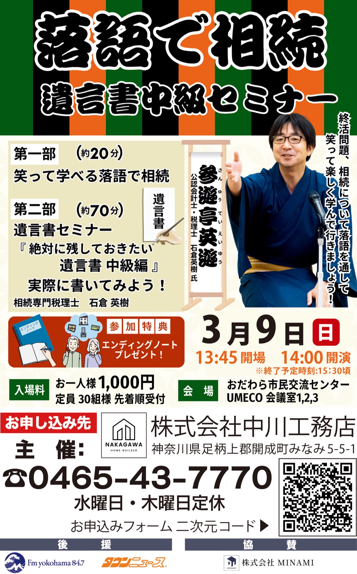 毎回好評の「落語で相続」。おだわら市民交流センターUMECOで3月9日(日)午後2時から。