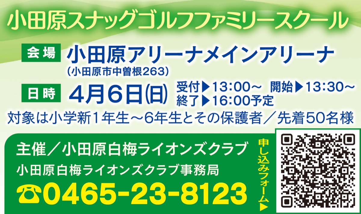 小田原白梅ライオンズクラブ(小田善三会長)が4月6日(日)、小田原アリーナで参加無料の「小田原スナッグゴルフファミリースクール」を初開催する。現在、参加小学生とその保護者を募集している(定員50人)。午後1時30分開始(受付1時〜)で4時終了予定。