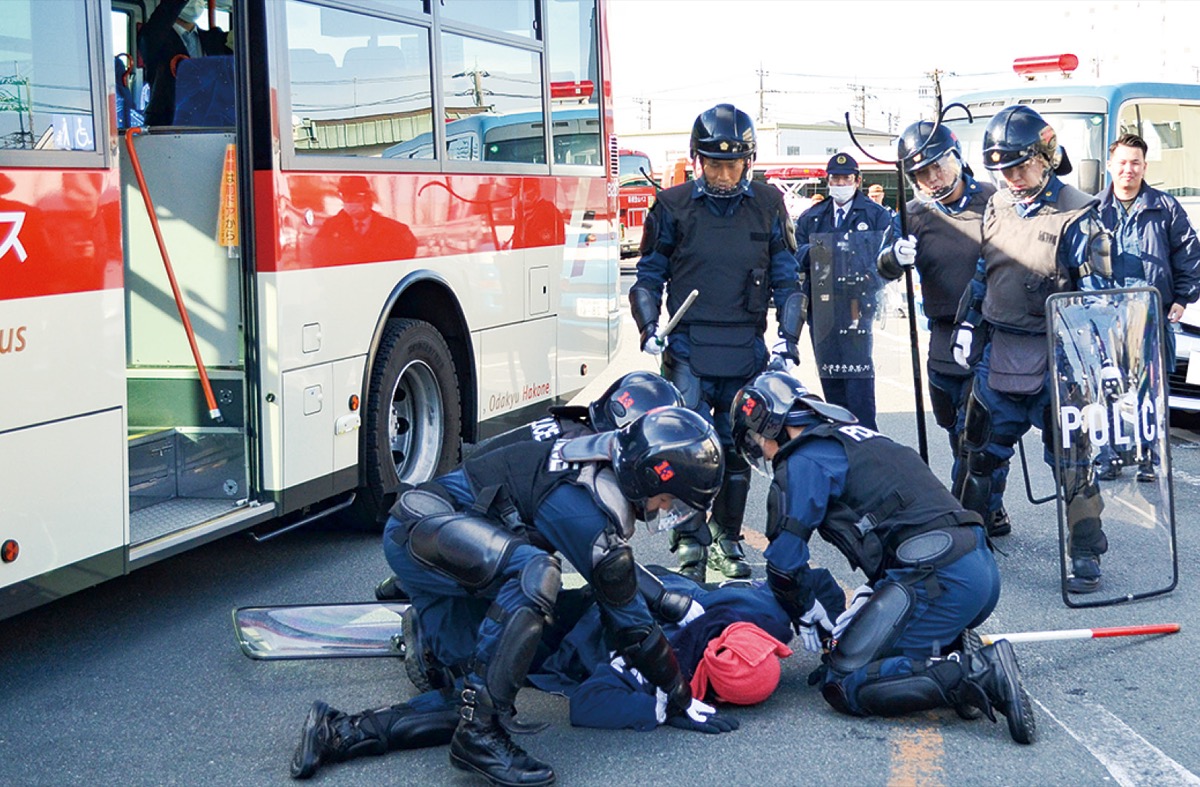 小田原警察署(永野進署長)が2月12日、バスジャックを想定した訓練を箱根登山バス(株)の小田原営業所で行った=写真。非常時の対応策を確認する目的で、同社との合同訓練は初めて。