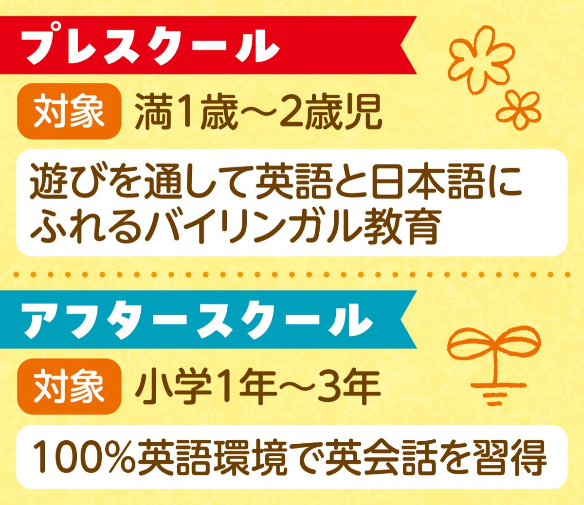 今回開校されたプレスクールコースは週2回から通え、英語90%・日本語10%の環境で音楽や運動、アートなどに親しむ。お昼寝や自由時間もあり、月齢に応じた無理のないカリキュラムで初めての集団生活も安心だ。さらに、延長保育の利用で一日中、子どもを預けられるなど、共働き家庭への支援も充実している。