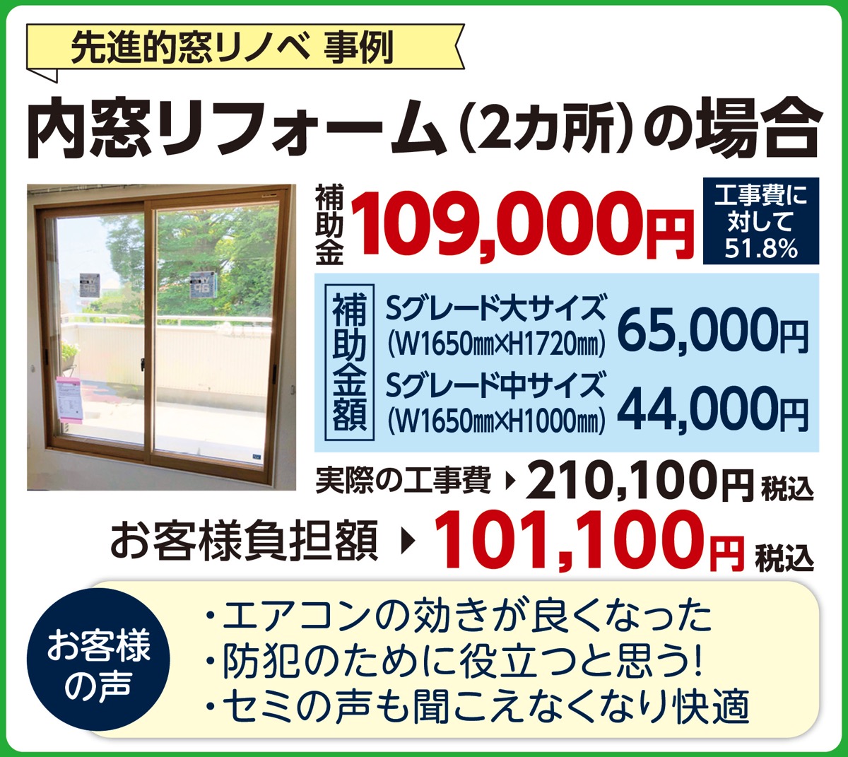 断熱窓への改修は防音・防犯や光熱費削減などメリットも多いといい「光熱費が高騰している今、補助金でお得に省エネ対策はいかがでしょうか」という。同じ補助事業「子育てグリーン住宅支援事業(子育て世帯に限らず)」と併用可。詳しくはお問い合わせを。