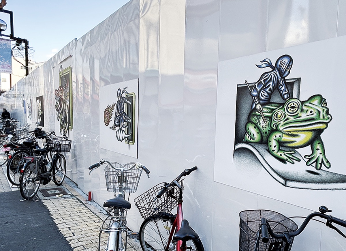 工事現場の仮囲いを活用した、同商店街による「小田原忍者ストリート〜とびだす風魔忍者」の取り組み。城下町の歴史、文化にちなんだフォトスポットを作る狙いで、昨年7月に設置し、工事の都合により一度外されていた。関西を拠点に創作活動を行う永井秀幸さんのデザインで、ガマガエルに乗った忍者や恐竜への変化などが、飛び出すように描かれている。