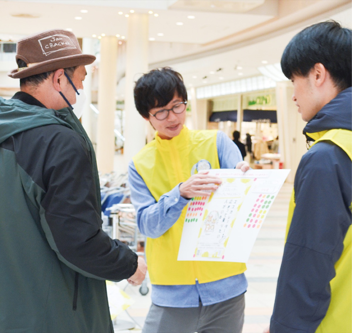 エスカレーターの利用者間の配慮や多様性を受け入れる意識を高め、誰もが心地よく移動できる地域社会の実現を目指して実施。チラシやノベルティを配りながら立ち止まるマナーの大切さを説明したほか、エスカレーターの普段の使い方を尋ねるアンケートや動画上映も行い、利用者に啓発した。