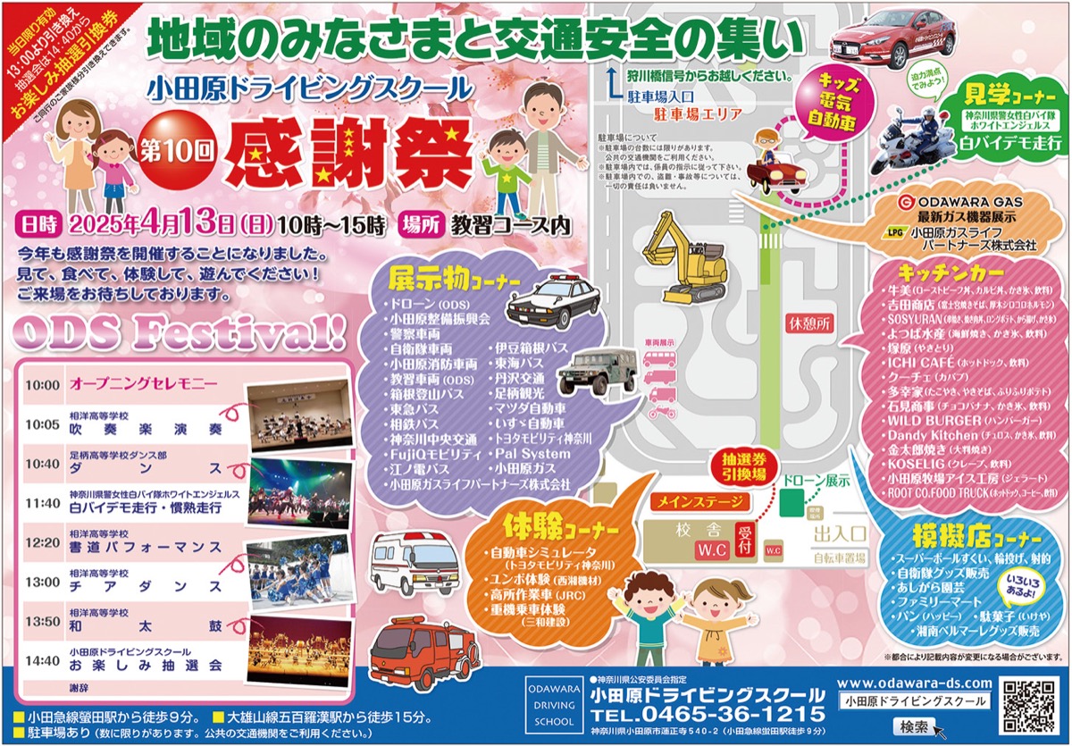 市内蓮正寺の小田原ドライビングスクール(秋山実社長)が4月13日(日)、「第10回感謝祭」を開催する。教習コースを開放し、乗車体験や車両展示、ステージイベントなど多彩な催しが行われる。午前10時から午後3時まで。入場無料で駐車場あり。