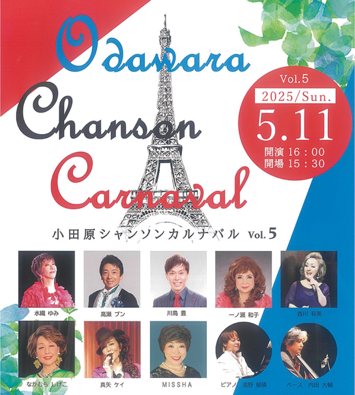 小田原レーヴ・ド・シャンソン主催の「小田原シャンソンカルナバル」が5月11日(日)、小田原三の丸ホール・小ホールで開催される。午後3時30分開場、4時開演。