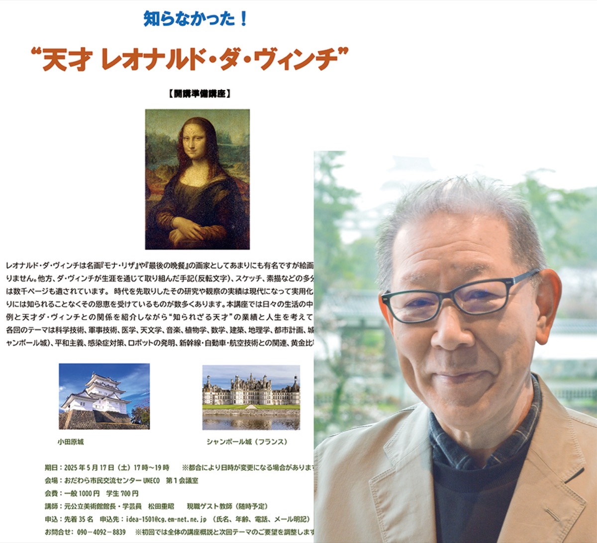 昨年小田原市に移住した学芸員の松田重昭さん(77)がこの春から、レオナルド・ダ・ヴィンチの業績や人生を紹介する講座を開講する。5月17日(土)には、おだわら市民交流センターUMECOで準備講座を開催。講座の概要を解説し、取り上げるテーマの要望を聞く。午後5時〜7時。一般1000円、中高大生700円、小学生以下無料。先着35人。
