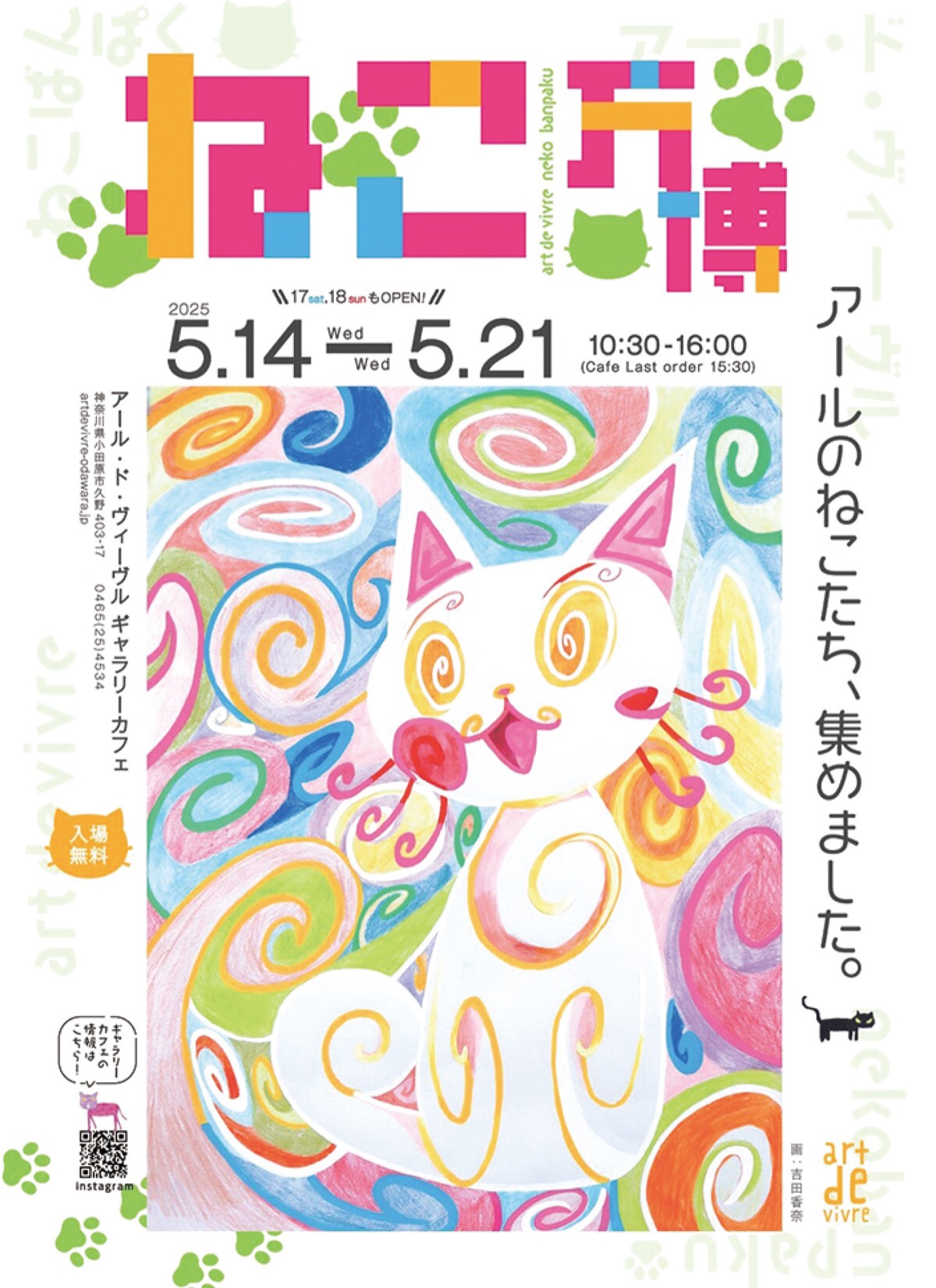 アート作品制作などを通じて障害者と社会とのつながりを生む活動を展開する同法人。今回のイベントではメンバーが「世界で暮らすねこたち」を自由な発想で描いた。担当者は「かわいいねこを愛する気持ちにボーダーはありません。癒されに来てみては」と来場を呼び掛けている。午前10時30分〜午後4時(カフェのラストオーダーは3時30分)。会期中は休みなし。入場無料。(問)同法人【電話】0465・25・4534