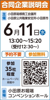 小田原・箱根の企業が参加する合同企業説明会が6月11日(水)、小田原お堀端コンベンションホール(小田原駅徒歩5分)で開催される。午後1時〜3時20分。予約不要、参加無料、履歴書不要。