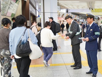 この日は松本光好小田原警察署長や交通安全団体など約40人が参加し、駅利用者に交通安全を啓発するチラシやポケットティッシュを配った。