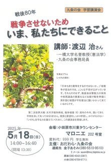 講師は、一橋大学名誉教授(憲法学)で九条の会事務局員の渡辺治さん。「戦争させないため いま、私たちにできること」をテーマに、憲法の歴史や将来の展望などを学び、「戦争のない平和な社会を実現すること」に向けて、戦後80年のタイミングで改めて考えを深める。