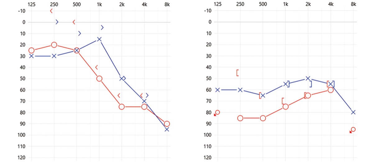 下の図は聴力を表したグラフですが、ひとくちに難聴と言ってもその聴力低下具合は様々です。単純な音量の上げ下げだけでは不十分。各個人の聴力に合わせた調整が重要ですが、通販の安価な機器では不可能です。