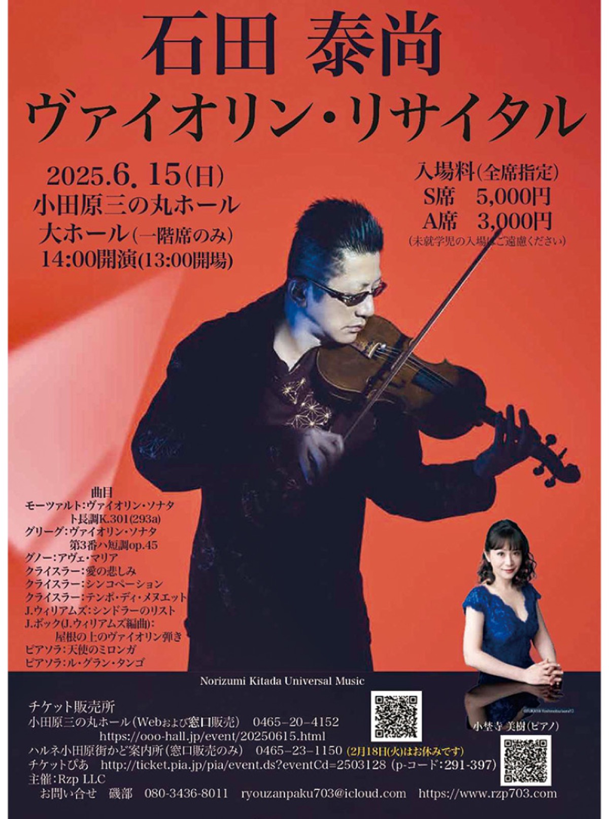 小田原三の丸ホール大ホールで6月15日(日)、石田泰尚ヴァイオリン・リサイタルが開催される。午後2時開演(1時開場)。本紙読者2組4人にチケットをプレゼントする(一般販売は終了)。