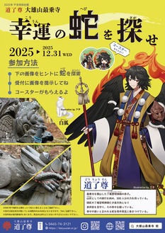 大雄山最乗寺で、今年の干支である”へび”を境内敷地内で探すプレゼント付きのユニークな企画『幸運の蛇を探せ』が行われている。期間は12月31日(水)まで。誰でも参加可能で無料。