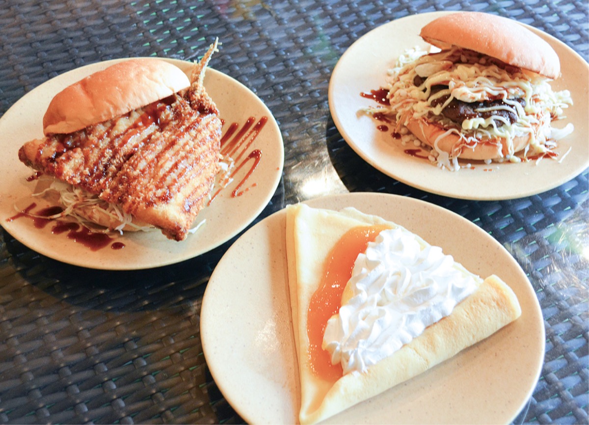 今回の新商品は3品。「矢郷農園」で収穫されたミカンを障害者福祉サービス事業所「第3ありんこホーム」がマーマレードに加工し、生クリームと合わせたクレープ「小田原みかんホイップ」と、「小田原蒲鉾いせかね」のちくわを主役にした「小田原ちくわバーガー」、「湘南魚類(株)」から仕入れた地元産アジを1匹使用した「小田原アジフライバーガー」。いずれも地域のマルシェでの出店を通じてつながり、今回のコラボに至った。