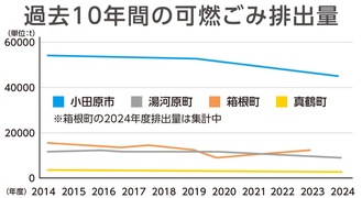 5月30日の「ごみゼロの日」にちなみ本紙では小田原市、箱根町、湯河原町、真鶴町を対象に可燃ごみに関するアンケートを実施。排出量の傾向や減量化への施策を聞いた。